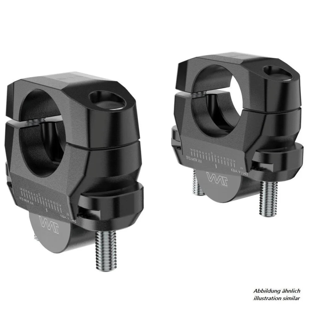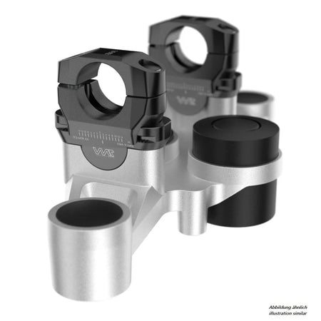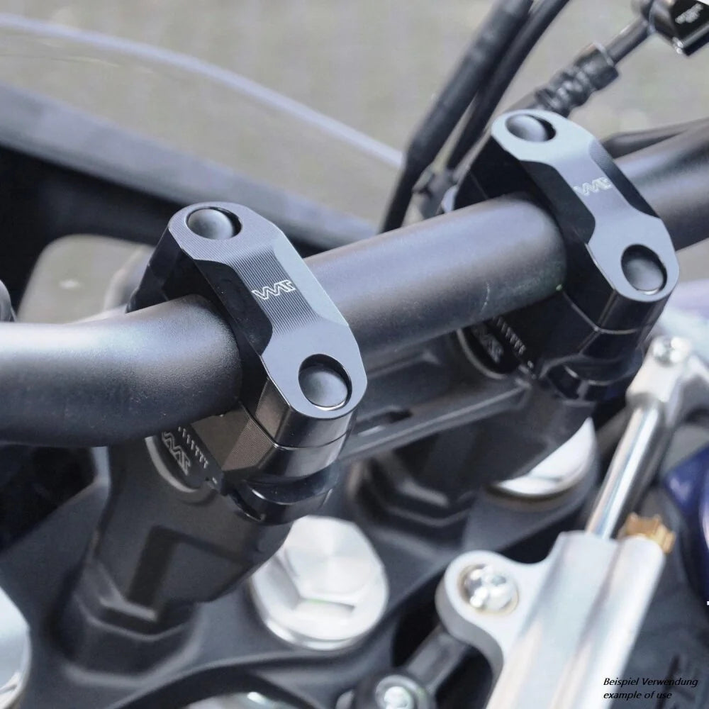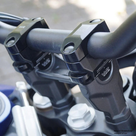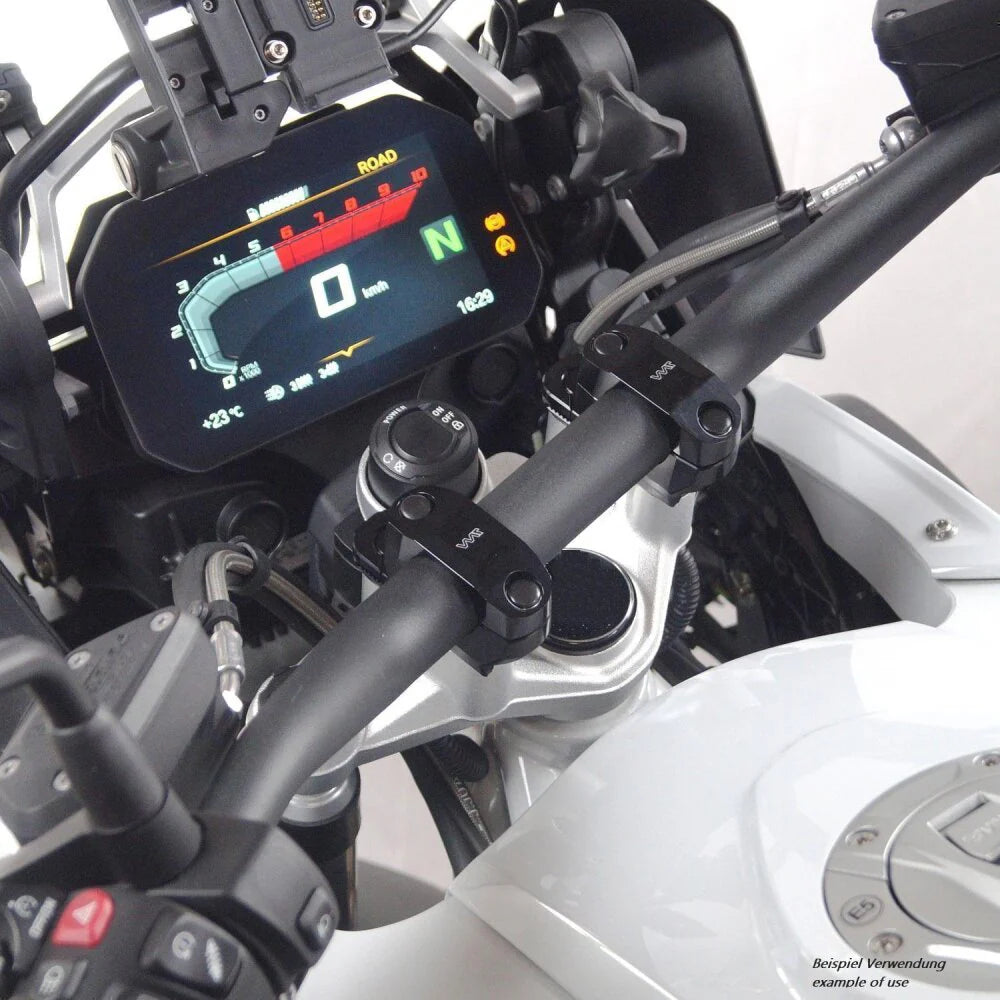 These adjustable handlebar risers are mounted on the original lower handlebar clamps. The adjustable offset allows the handlebars to be adjusted closer or further from the body in 2 mm increments (+/- 14 mm). The higher handlebar position results in a more relaxed seating position and a more direct riding feel. The offset allows the handlebars to be individually adapted to personal needs and riding characteristics.