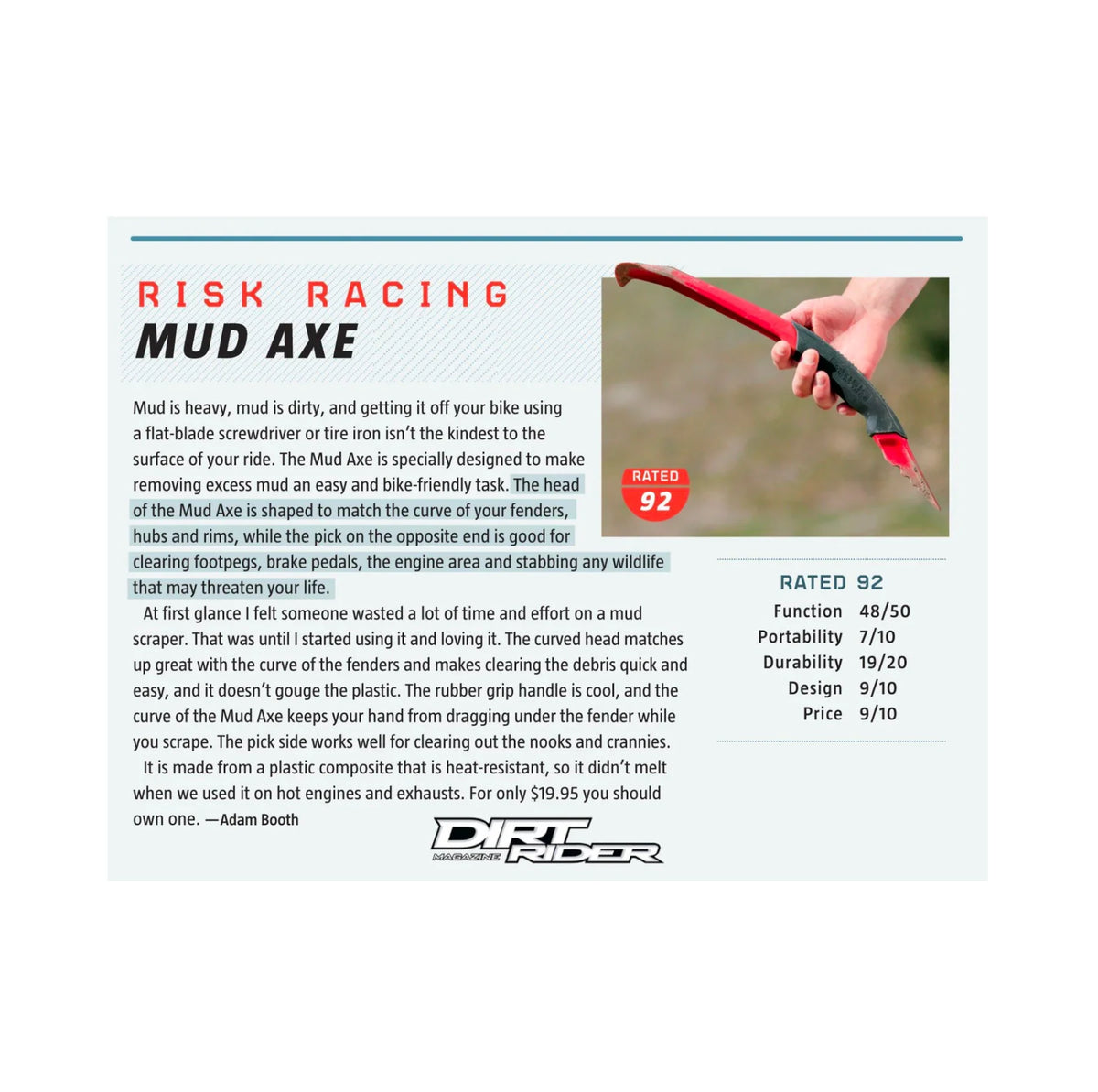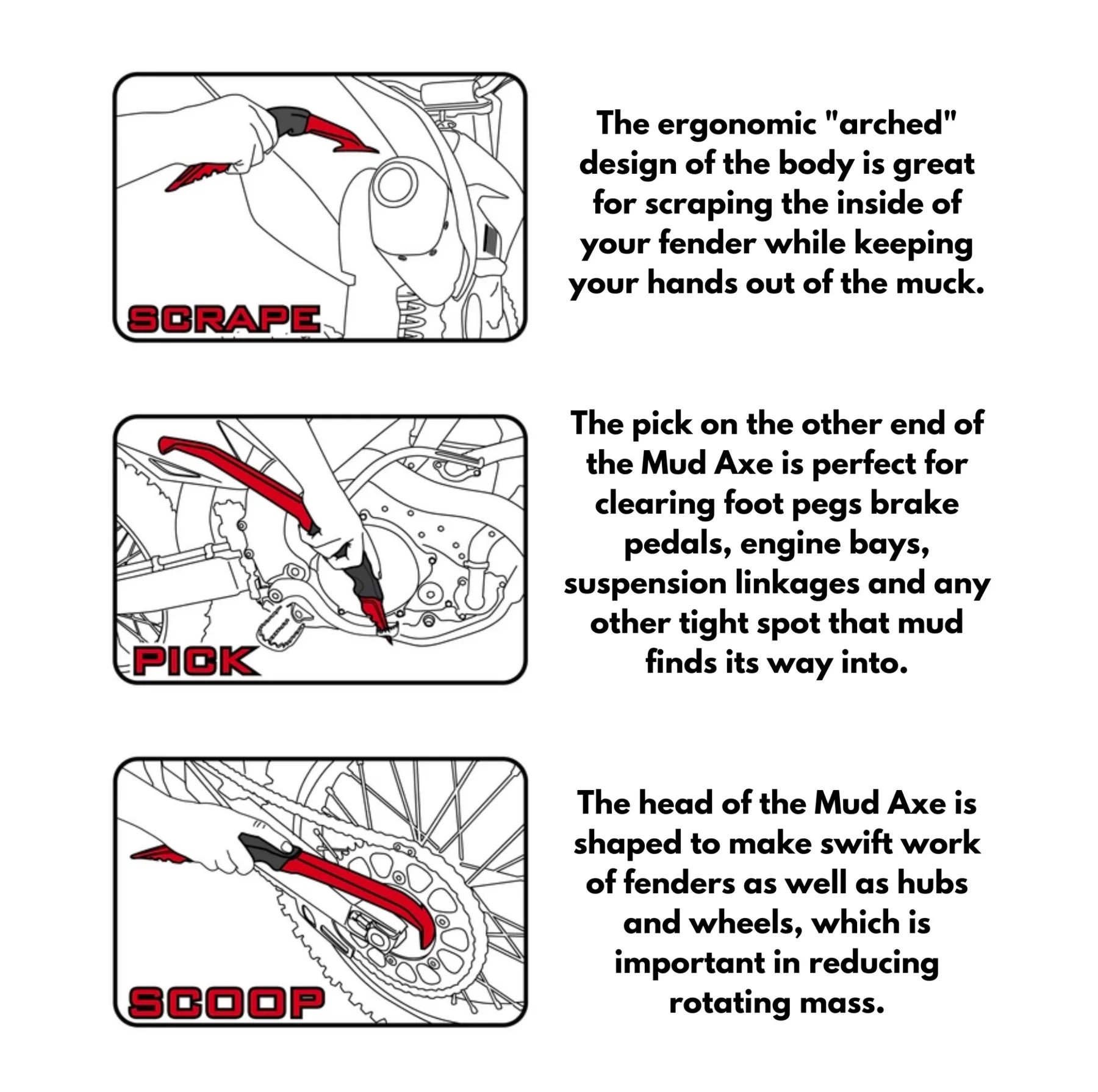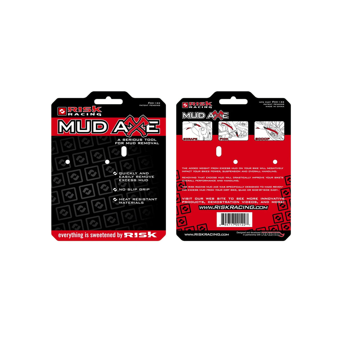 Removing the excess mud is always a dirty task. Historically, riders have used screwdrivers, sticks, or their bare hands to try and free their bikes from a thick coat of mud. All of these methods are inefficient and slow. Even when using a power washer, removing the majority of the mud first is a huge time saver, especially when water is in limited supply at the track. Luckily, Risk Racing now offers an alternative to screwdrivers and sticks with the new Mud Axe. The Risk Racing Mud Axe is specifically designed to make the task of removing excess mud from your dirt bike, quad or UTV quick and easy.